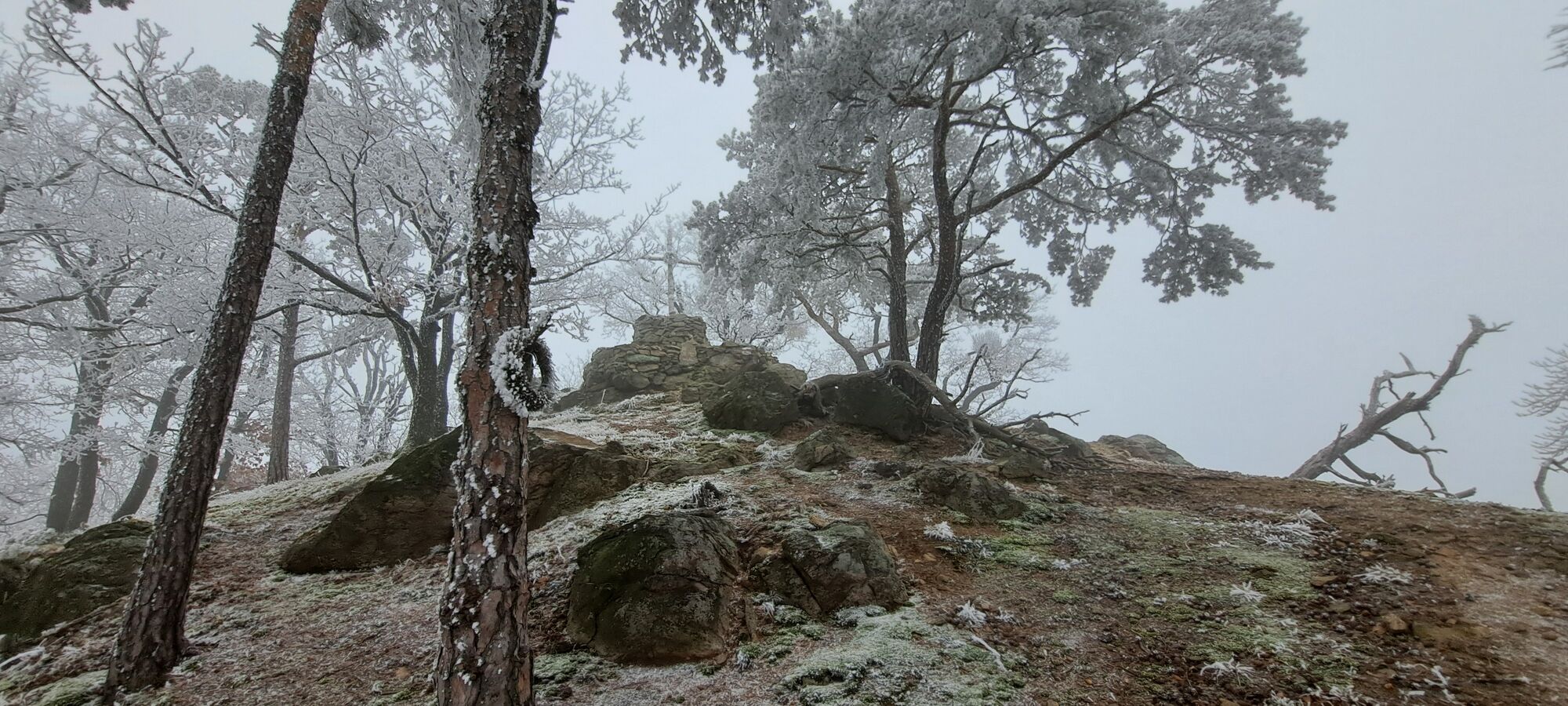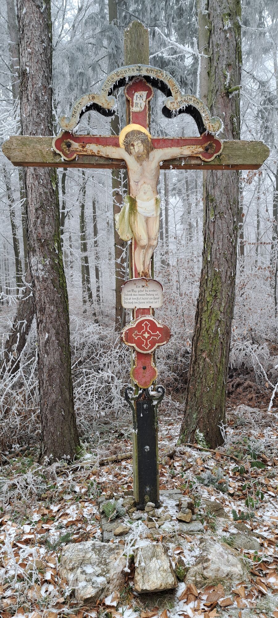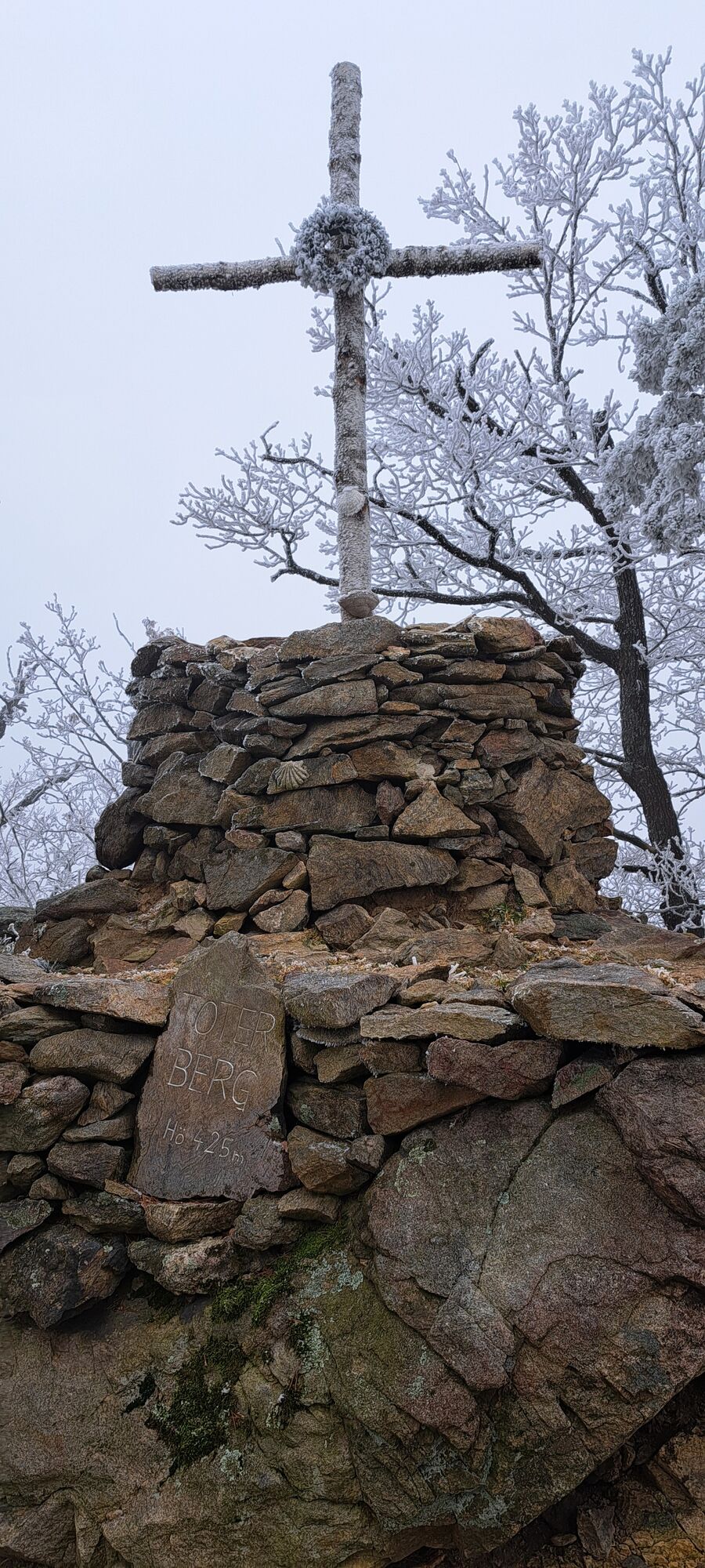 Danach weiter im Abstieg am Kamm offener (Moaß) entlang bis zu einer querenden Forststraße. Erstmal querend darüber und hoch zum mit Gipfel-/Pilgerkreuz bestückten Gipfel des "Toten Berges".
