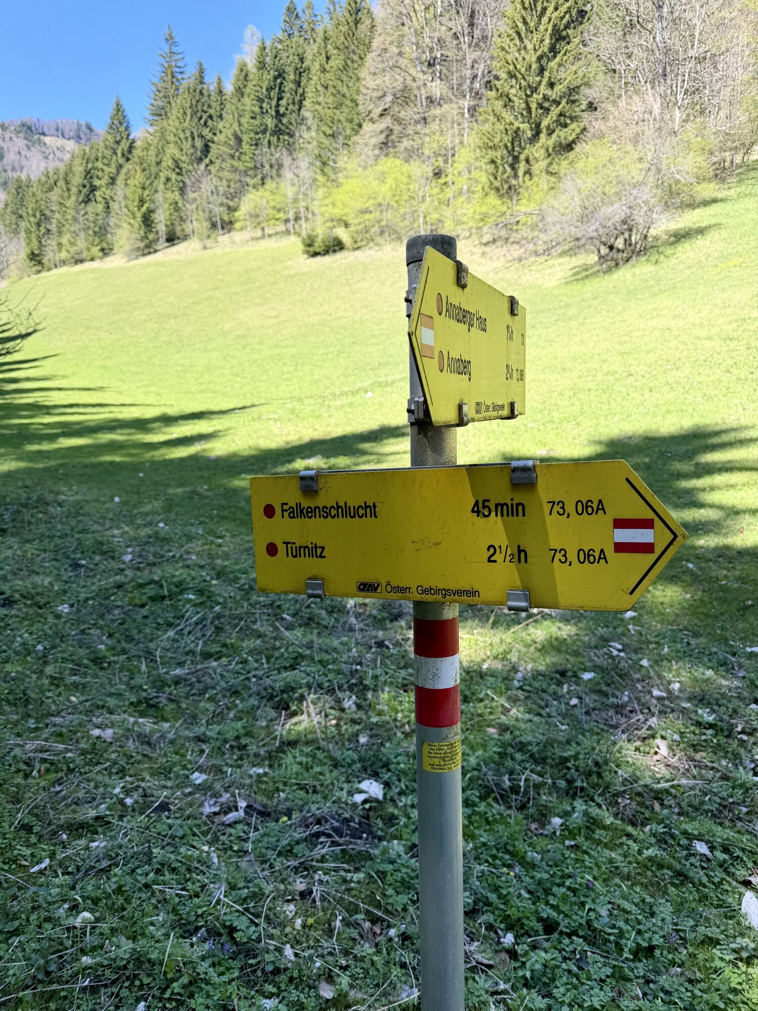 Start bei Parkplatz nach dem Eisernen Tor in Türnitz. Dem 06er folgend durch die Falkenschlucht und weiter bis zur Jagdhütte Ebenbauer und ca. 300m weiter bis zum Waldrand. Dort scharf rechts eine Almwiese (Ebenbauer Alm) rauf Richtung Lindkogel (Achtung: kein markierter Weg!!!) und weiter zum Tirolerkogel/Annaberger Haus. Von dort über Dachsental wieder retour zum Parkplatz.
