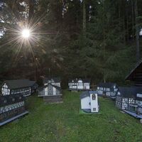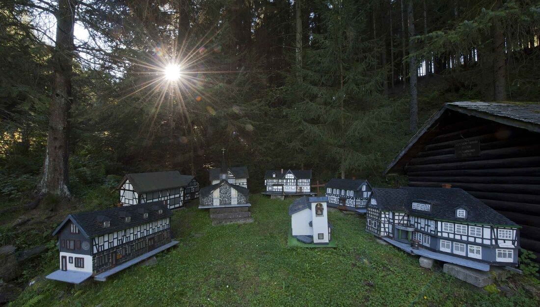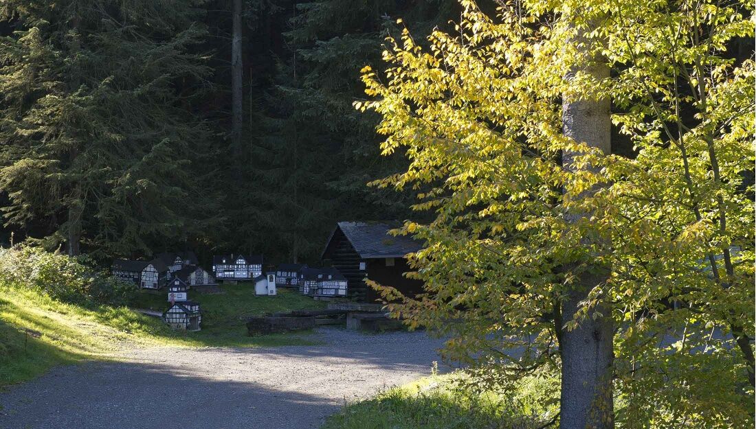 Weiter geht es mit dem Wanderzeichen der Golddorf-Route. Sie überqueren die L839, zwischen Grevenstein und Wenholthausen. Ca. 200 m nach der Straßenüberquerung verlassen Sie das Wanderzeichen der Golddorf-Route und folgen stets dem Zeichen W6 bis zum Miniaturdorf Hammerkotten. Etwa 400 m hinter dem Hammerkotten halten Sie sich rechts, kurz danach wieder rechts und dann links mit dem Wanderzeichen X13. Nach ca. 1,2 km wenden Sie sich an einer Kreuzung mit vielen Wanderzeichen links mit dem E2 in Richtung der SGV-Hütte.