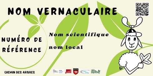 12 remarkable trees line the route. Each is identified by a small sign with: - a number corresponding to its position on the map, - the name of the tree in French, Latin, and Occitan (or in Canadian dialect for the twelfth tree...), - a sheep presenting the leaf and fruit of the species concerned.