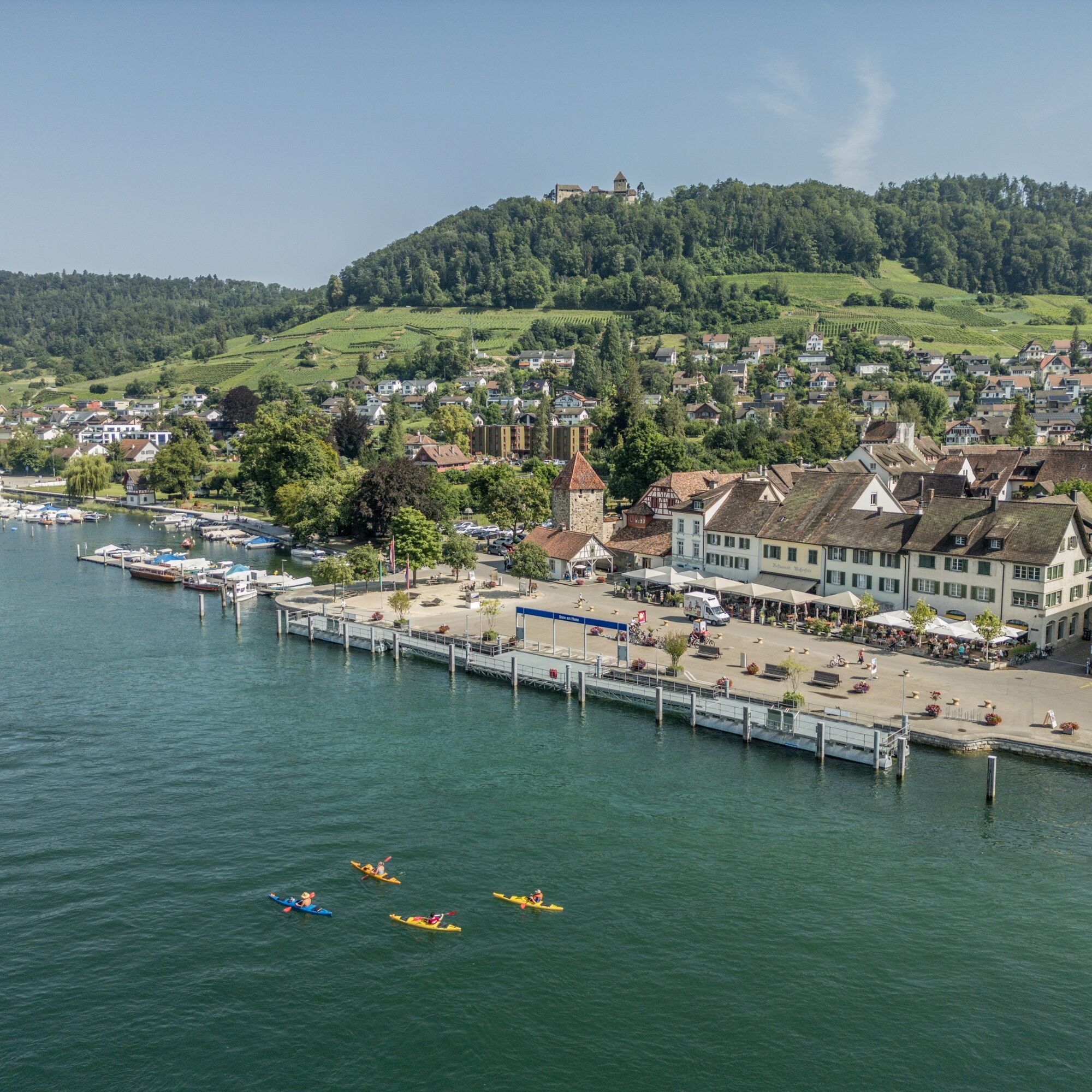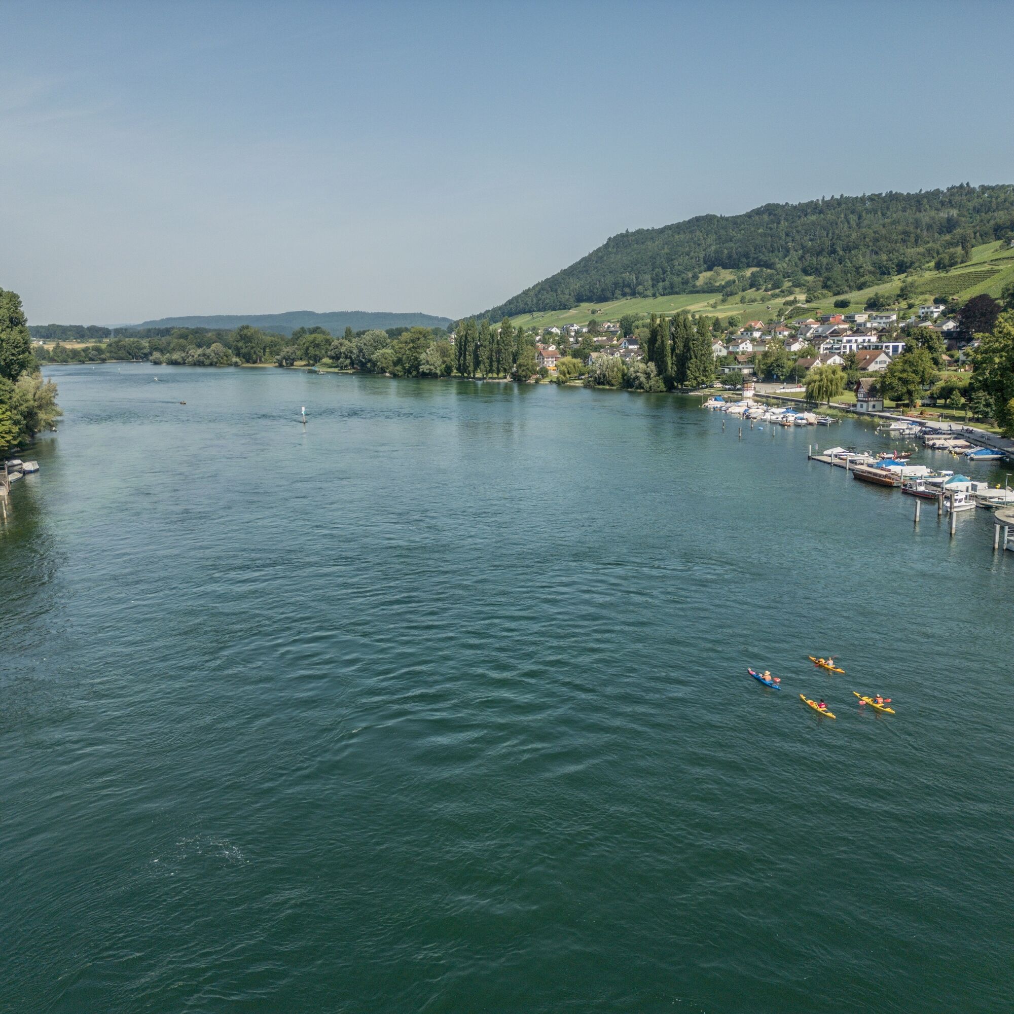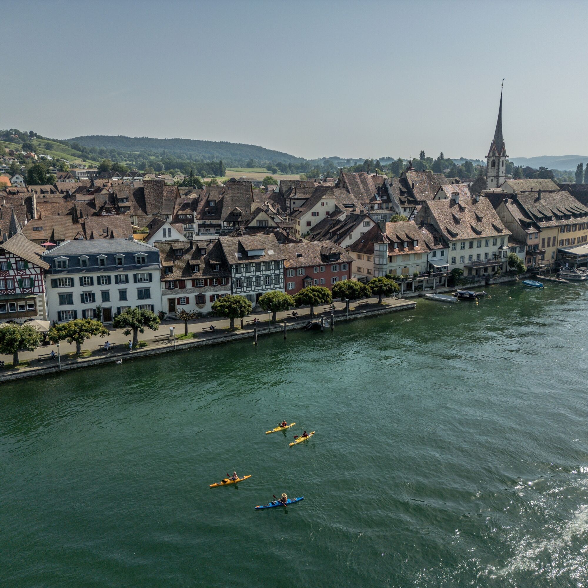 You start in the thousand-year-old town of Stein am Rhein, which is counted among the most beautiful towns in Switzerland. On the crystal-clear water, you glide relaxed, carried by the current, past historic houses, monasteries, and old fortifications – repeatedly interrupted by charming nature and inviting bathing beaches.