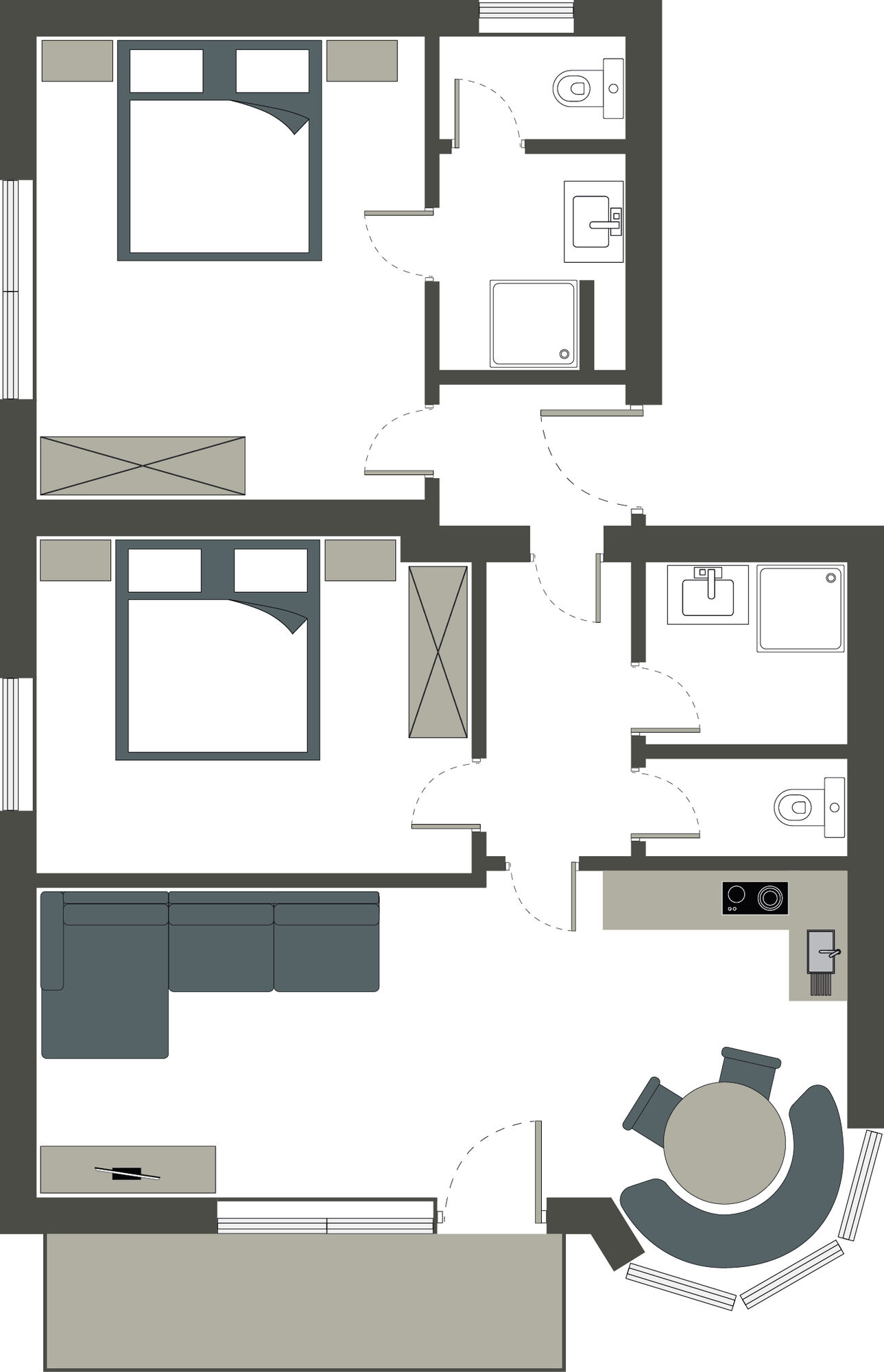 Sonnig, familienfreundlich ausgestattet und gemütlich-stilvoll eingerichtet, sind sie wertvolle Lieblingsplätze. Zwei der Wohnungen verfügen über zwei getrennte Schlafzimmer mit jeweils eigenem Badezimmer und sind somit ideal für Familien mit größeren Kindern oder befreundete Paare geeignet, da sie viel Privatsphäre bieten.