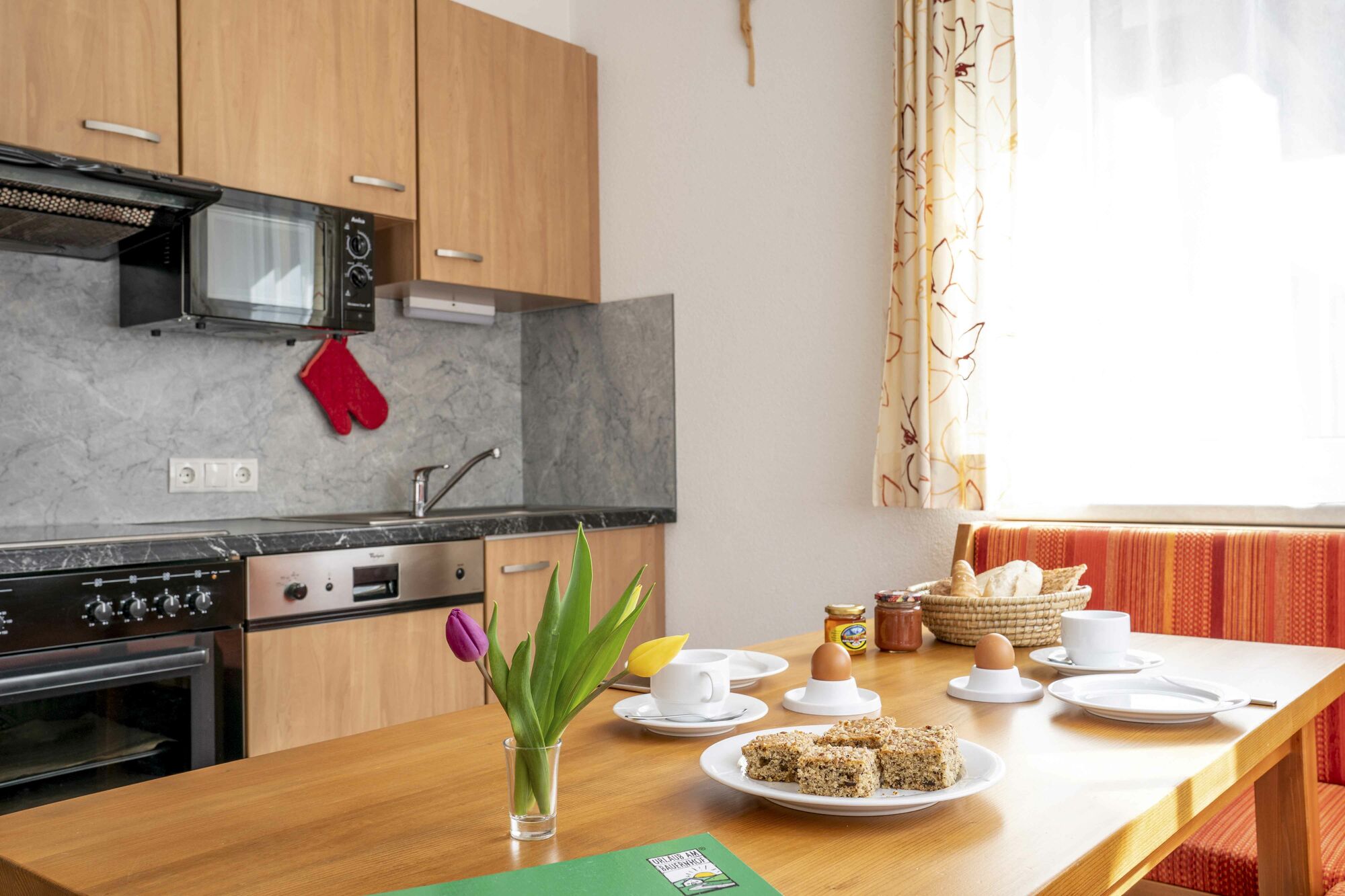 - Küche und Essecke: gut ausgestattetes Kücheninventar (Geschirr, Gläser, Küchenutensilien…) E-Herd mit Backofen, Mikrowelle, Kühlschrank mit Gefrierfach, Kaffeemaschine, Wasserkocher Geschirrspülmaschine mit Tabs, Küchenwäsche und Geschirrspülmittel