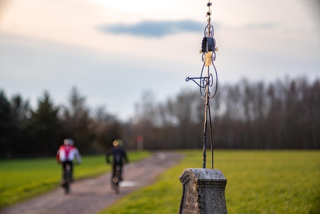Durch das Gut Lindenfels mit Hotel, Waldcafé und Hofladen geht der Weg leicht bergan zum Würzbacher Berg. Am einem Kreuz mit zwei Bänken, die zu einer kurzen Rast einladen, geht es links zum Startpunkt an der Kirche in Alschbach zurück.