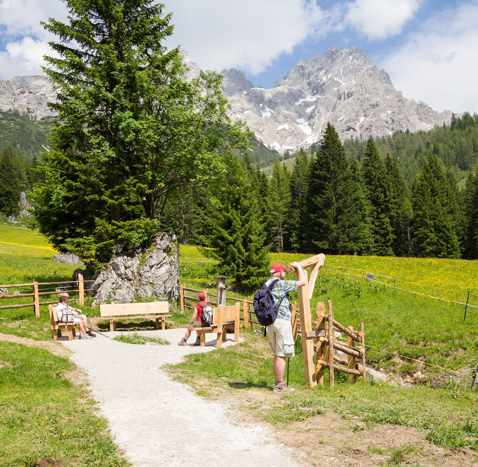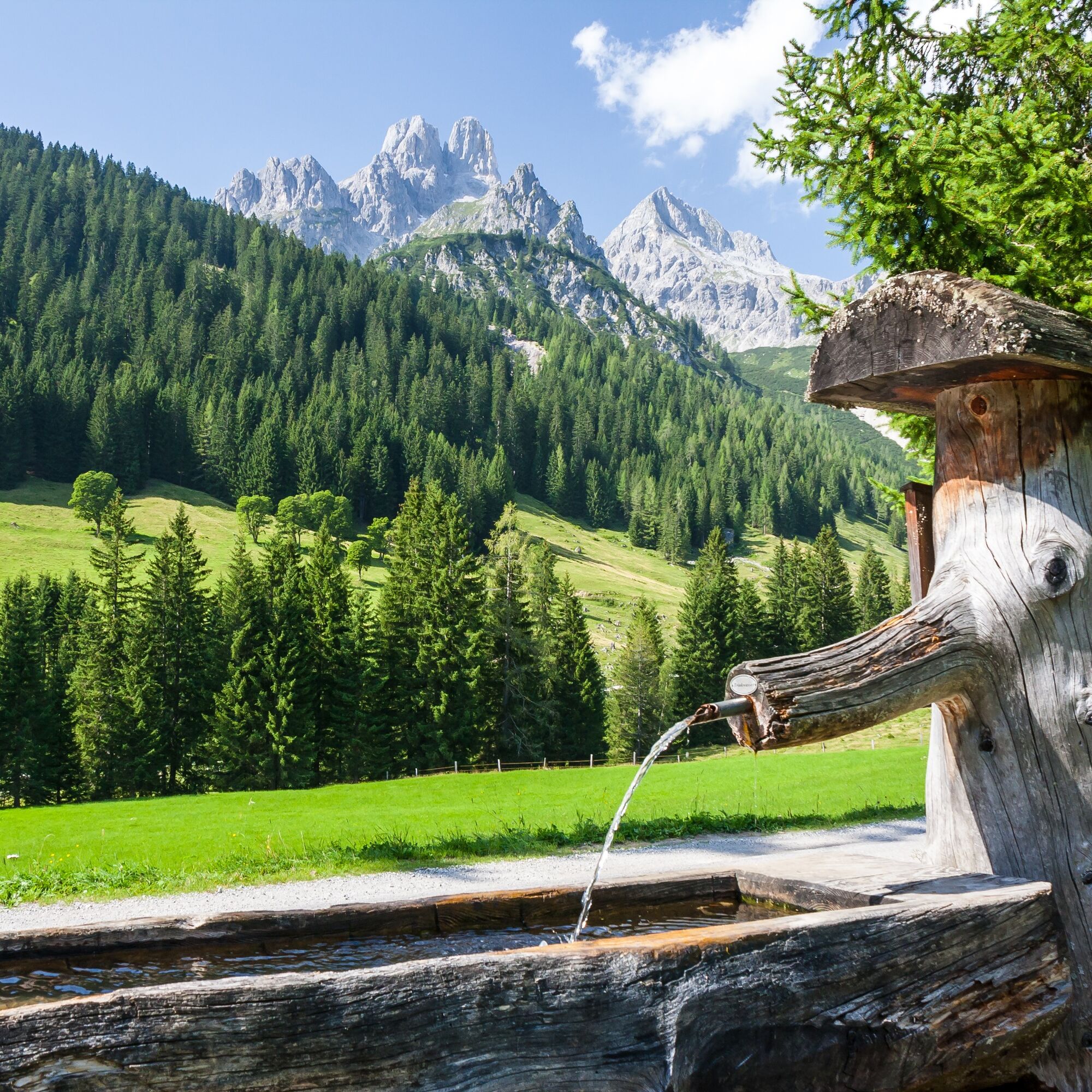 Tip: Drink a sip of the gorgeous, good spring water of the "Meeräugl-Quelle". Follow the road to Oberhofalm. From the Oberhofalm you can take a circular route across the alpine Almsee lake to the Unterhofalm. From there, the hiking bus returns to Filzmoos