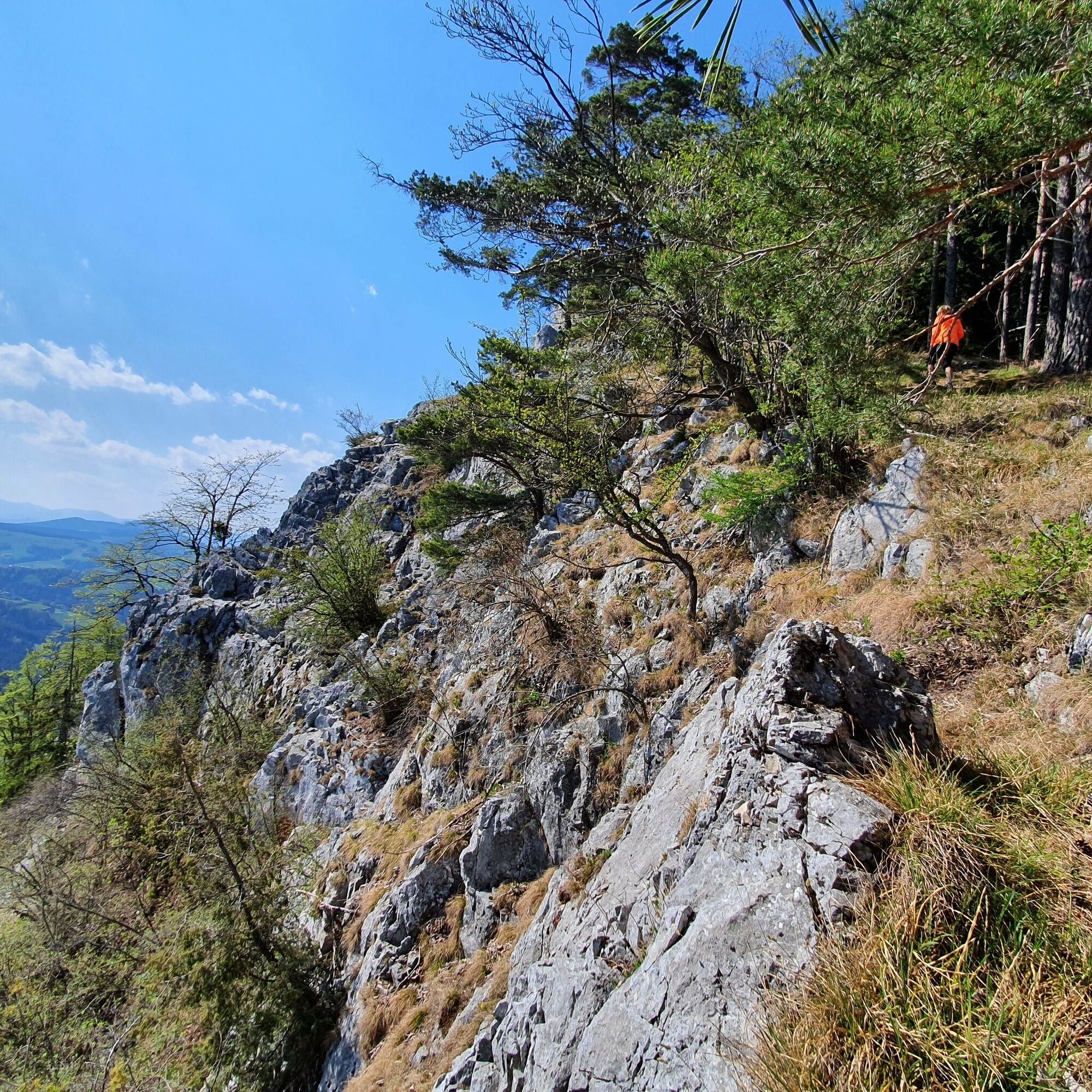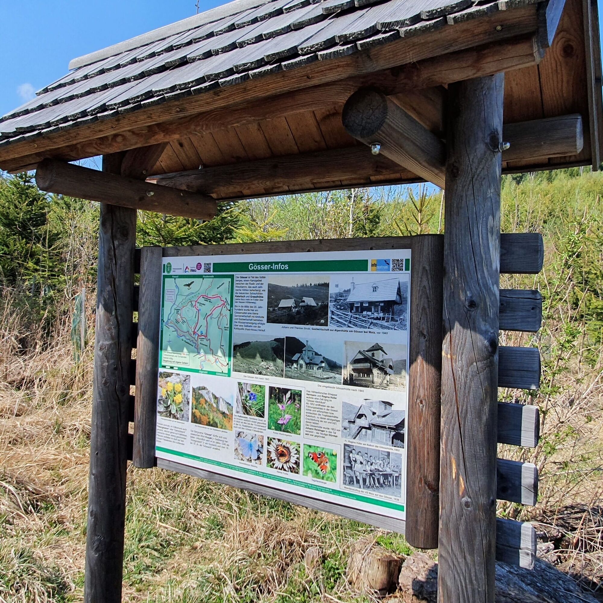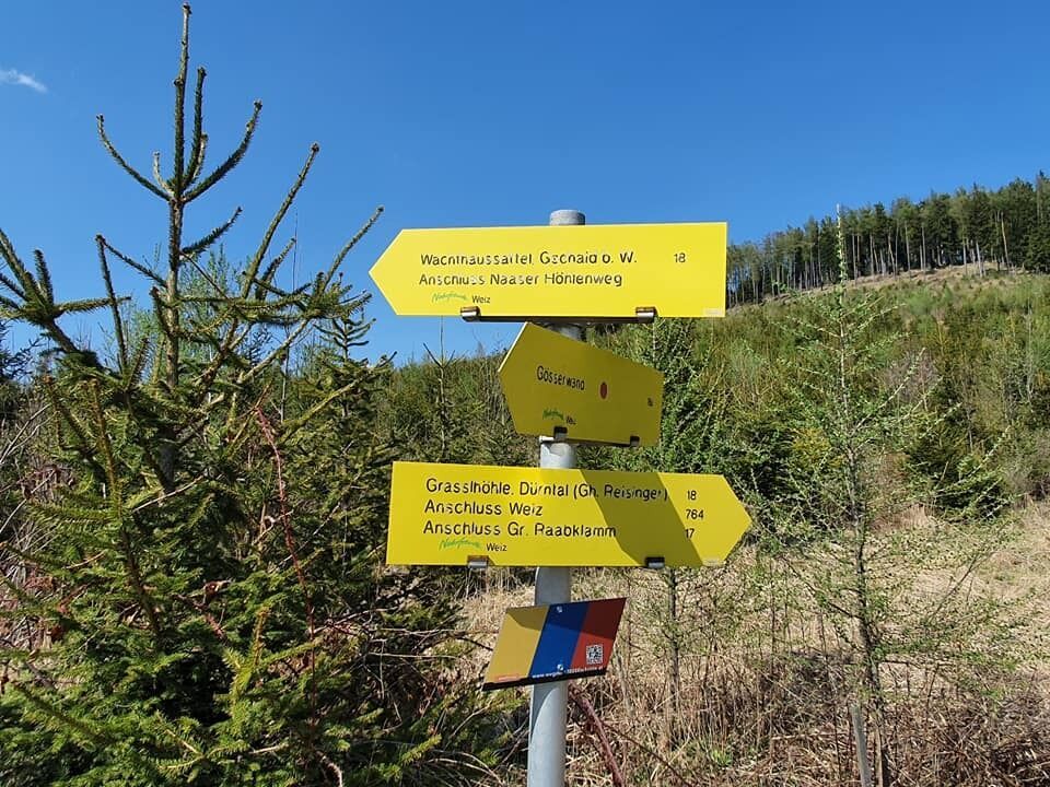 Die Region ist bekannt für seine Höhlensysteme. Insbesondere das Katerloch und die Grasslhöhle an der unser Weg vorbeiführt, erfreuen sich zahlreicher Gäste und sorgen für Staunen. Der Naaser Höhlenweg, dessen Beschilderung wir auf unserer Tour mehrmals begegnen, verbindet diese Höhlensysteme. Der Ausblick entang der Tour Richtung Naturpark Almenland wie auch das Hügelland der Oststeiermark und die Stadt Weiz ist traumhaft schön.