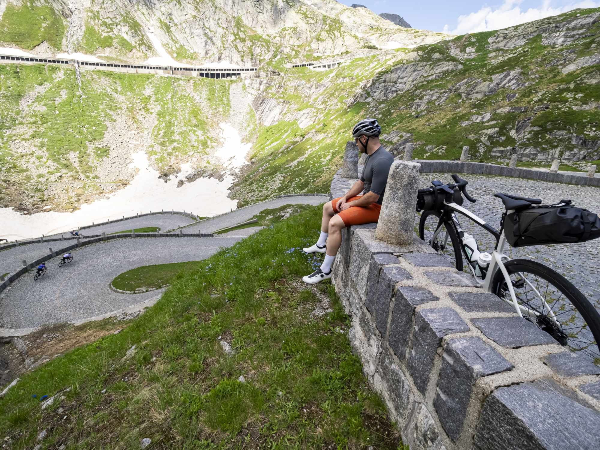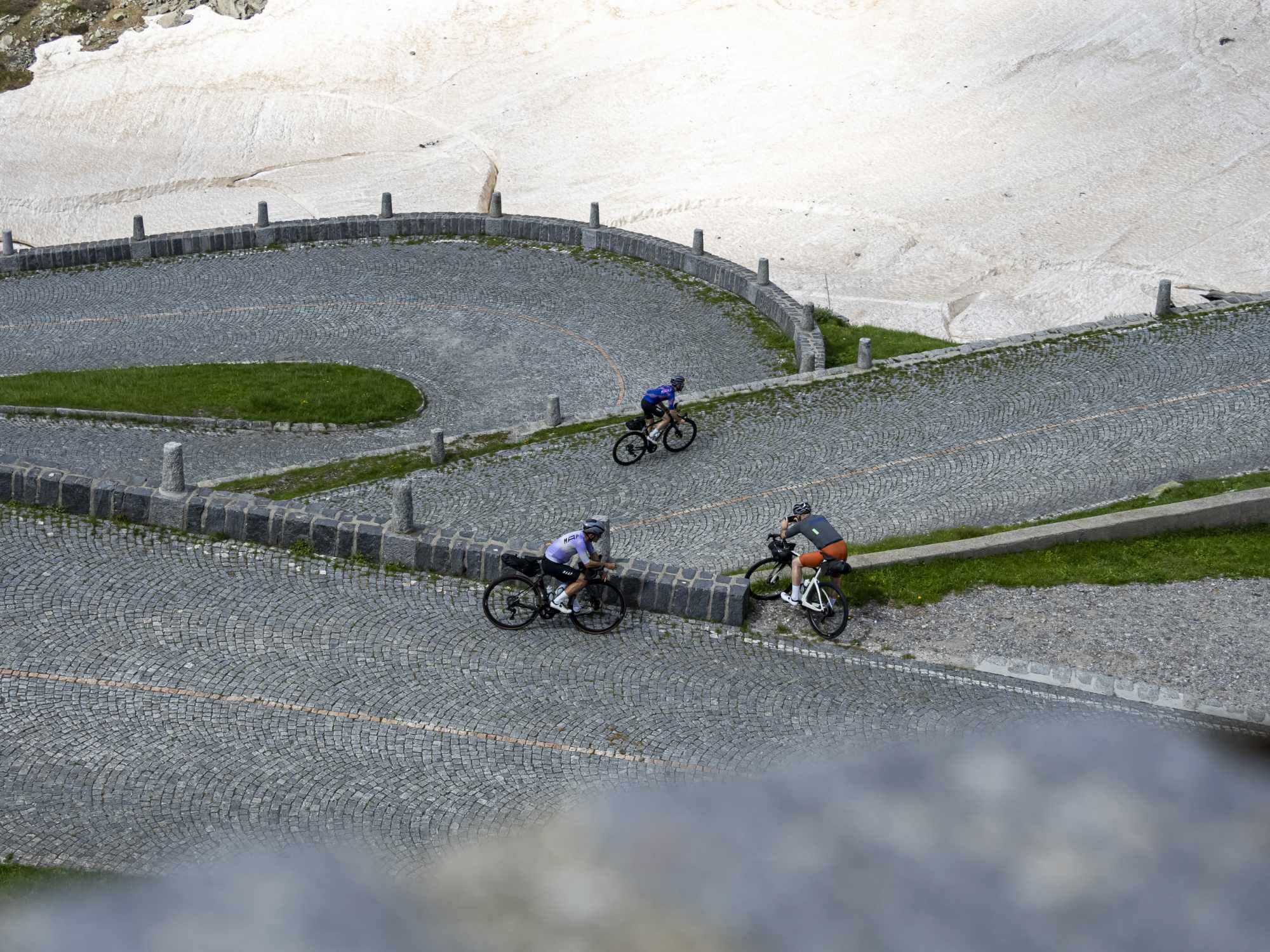 The ascent of the Tremola from Airolo to the Gotthard Pass is one of the most iconic and historic climbs in Switzerland. The road, largely paved with granite cobblestones, follows the original route of the pass, offering an authentic and timeless experience. From the centre of Airolo, you take the historic Tremola, which immediately unfolds with a series of regular hairpins. The gradient is steady and never extreme, but the cobbled surface makes the climb physically demanding and technical, requiring good pacing. The environment quickly becomes alpine: meadows, dry-stone walls and increasingly open views over the valley. In the final kilometres, the road winds through numerous spectacular hairpins, offering a unique view over the entire route below. Reaching the pass, at an altitude of 2,106 m, is a true symbolic achievement for every road cyclist. There is the possibility to continue briefly to the summit or to connect with other major alpine climbs.