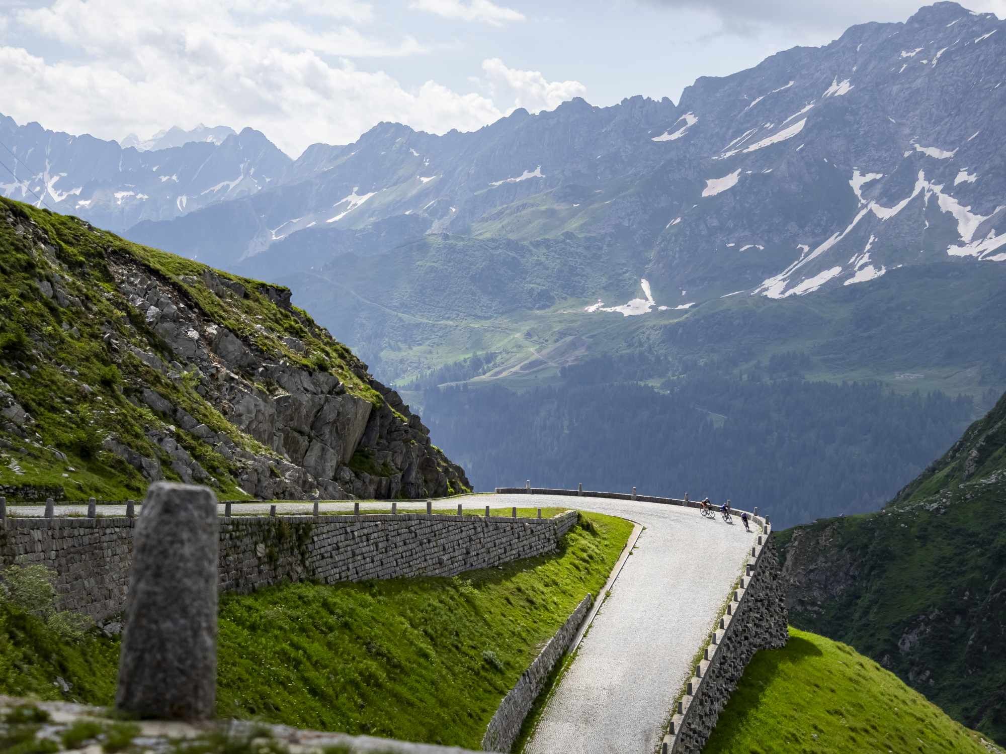 The granite cobbled road reveals its technical nature: you need to pedal steadily and carefully, while alpine meadows and dry-stone walls line the road.