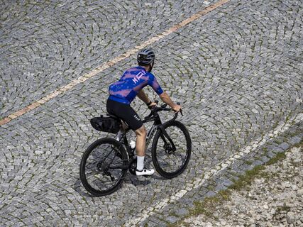 The climb becomes more evocative: hairpins follow one another with increasingly wide views over the valley below. The gradient remains moderate, but the cobbles require strength and good pacing.