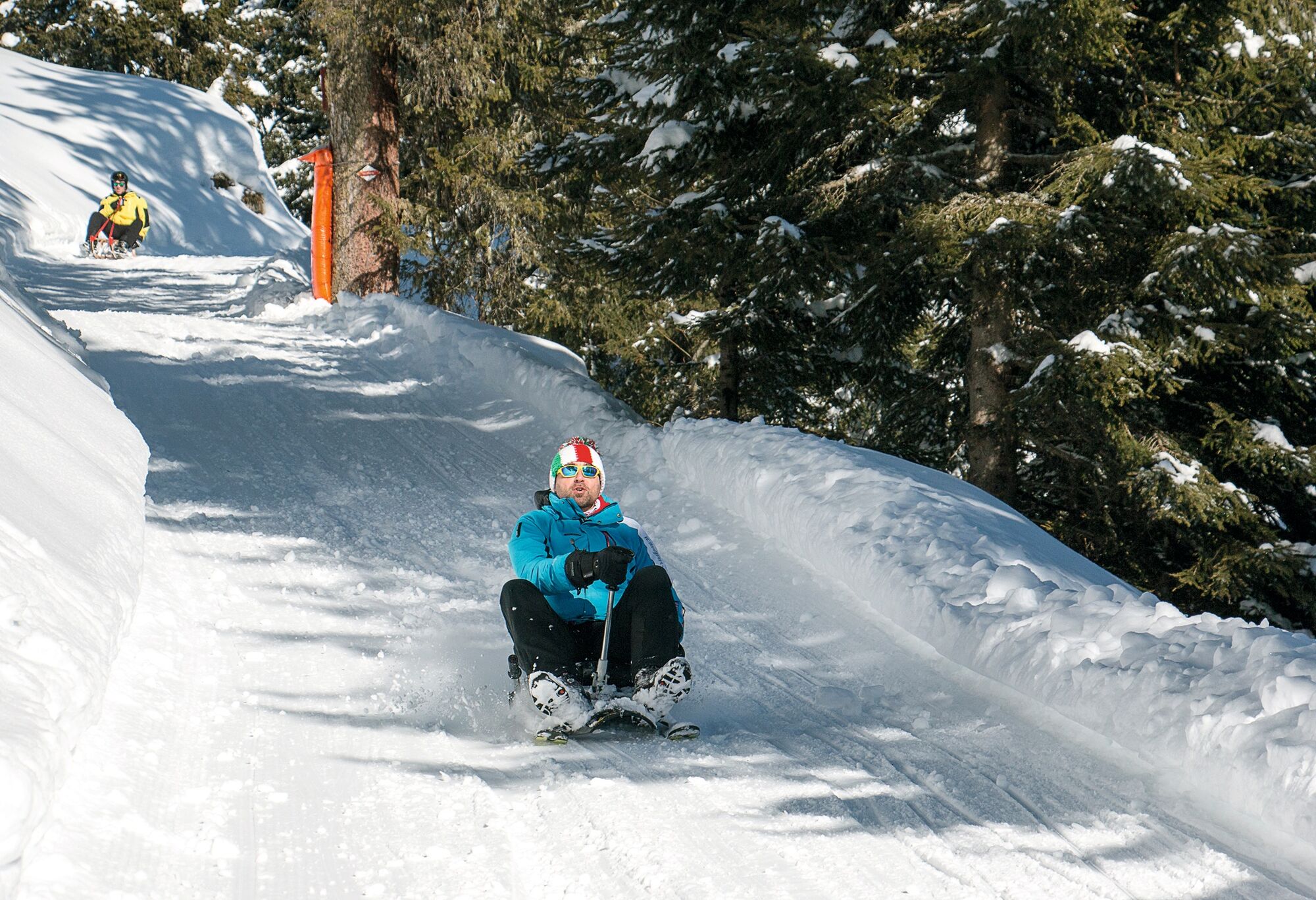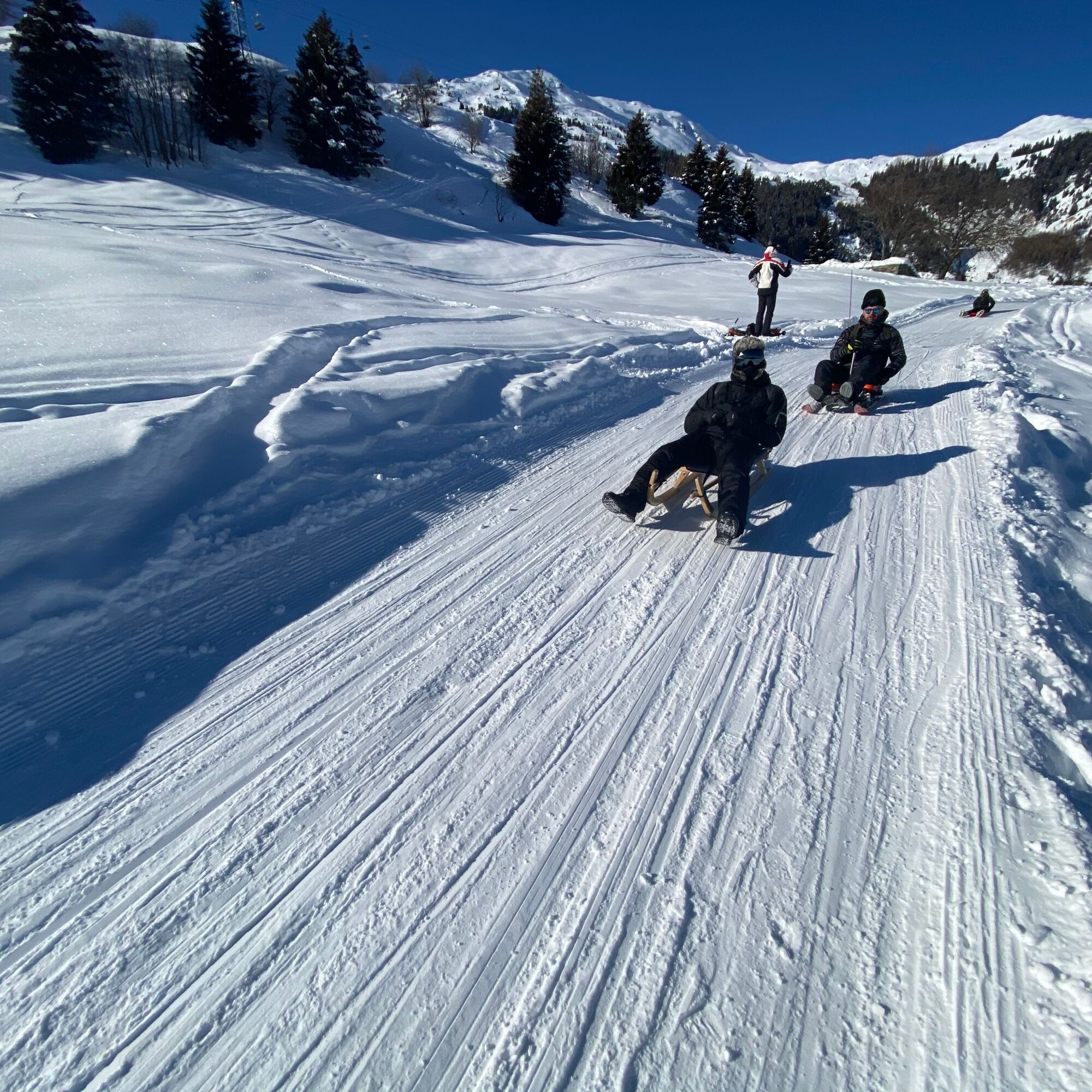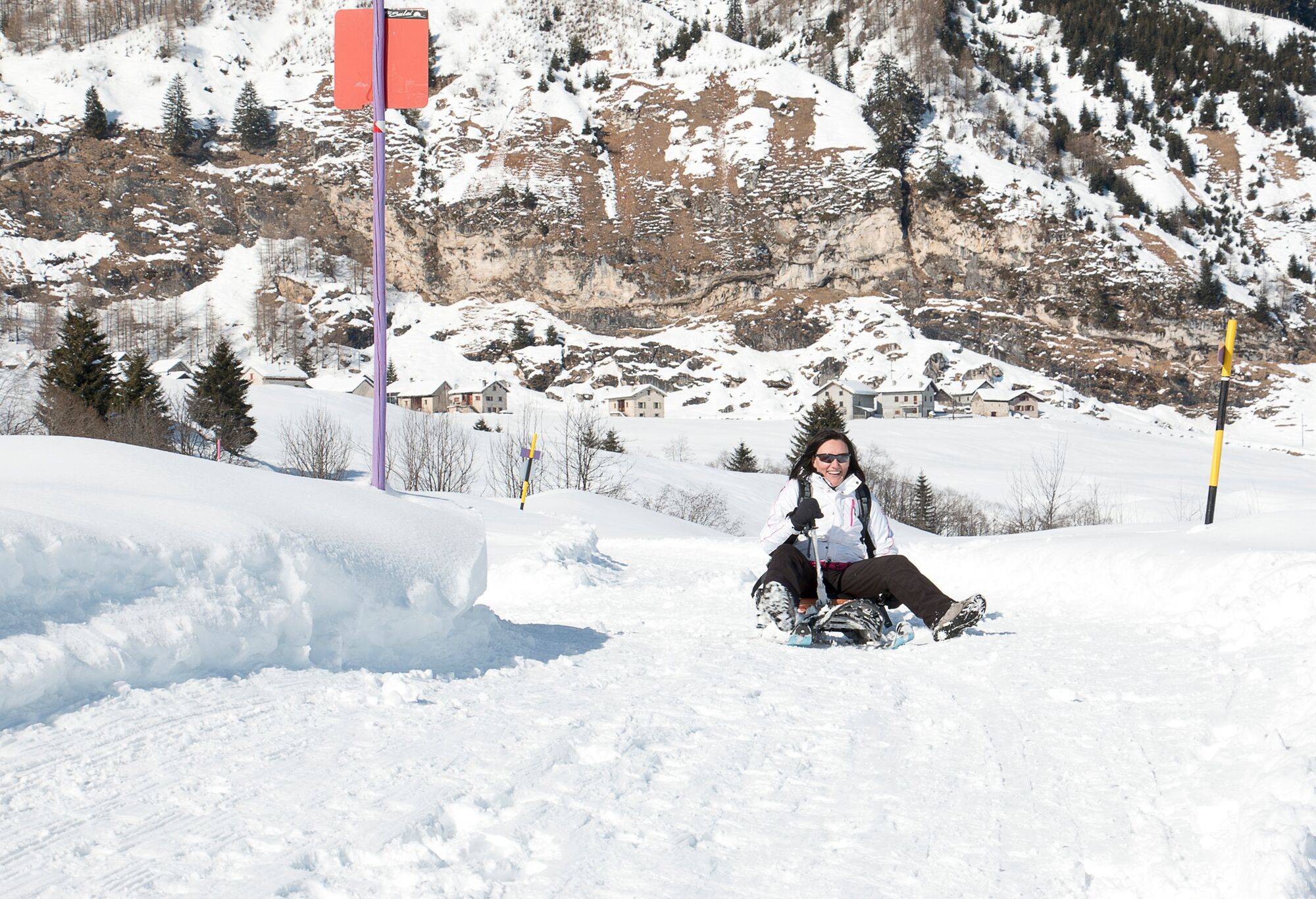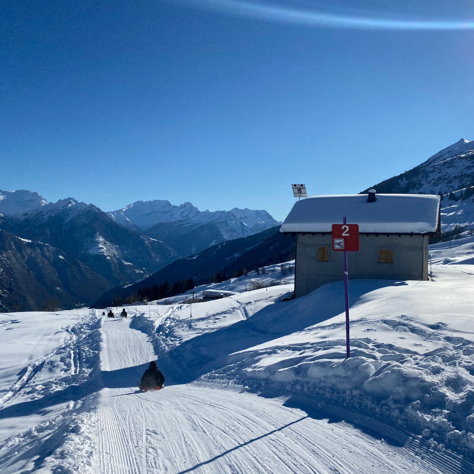Alternatively, if the snow conditions permit it, you can extend the downhill run for another five kilometres on a mountain road reserved for sledges, which leads to Leontica.