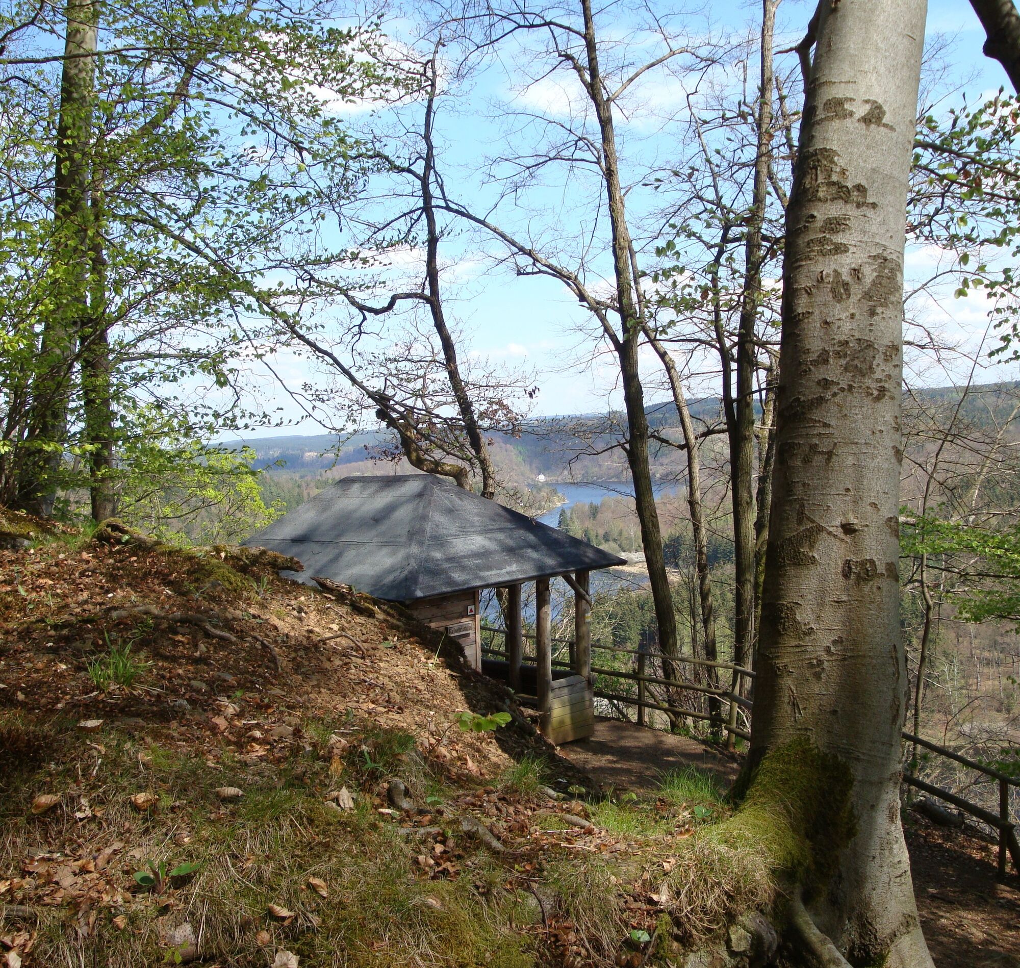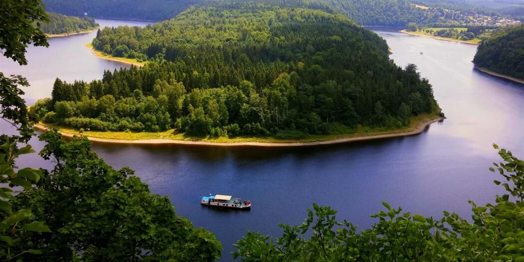 Angelandet am Aussichtspunkt Seeblick (Schiffsanlegestelle Heinrichstein) startet die Wanderung direkt am Ufer des Bleilochstausees in Richtung Saalburg.