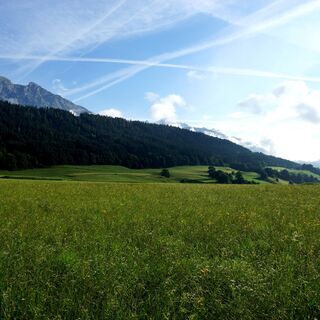 After a hairpin bend, the route leads downhill to the forest edge, then continues along meadows and fields back to the starting point.