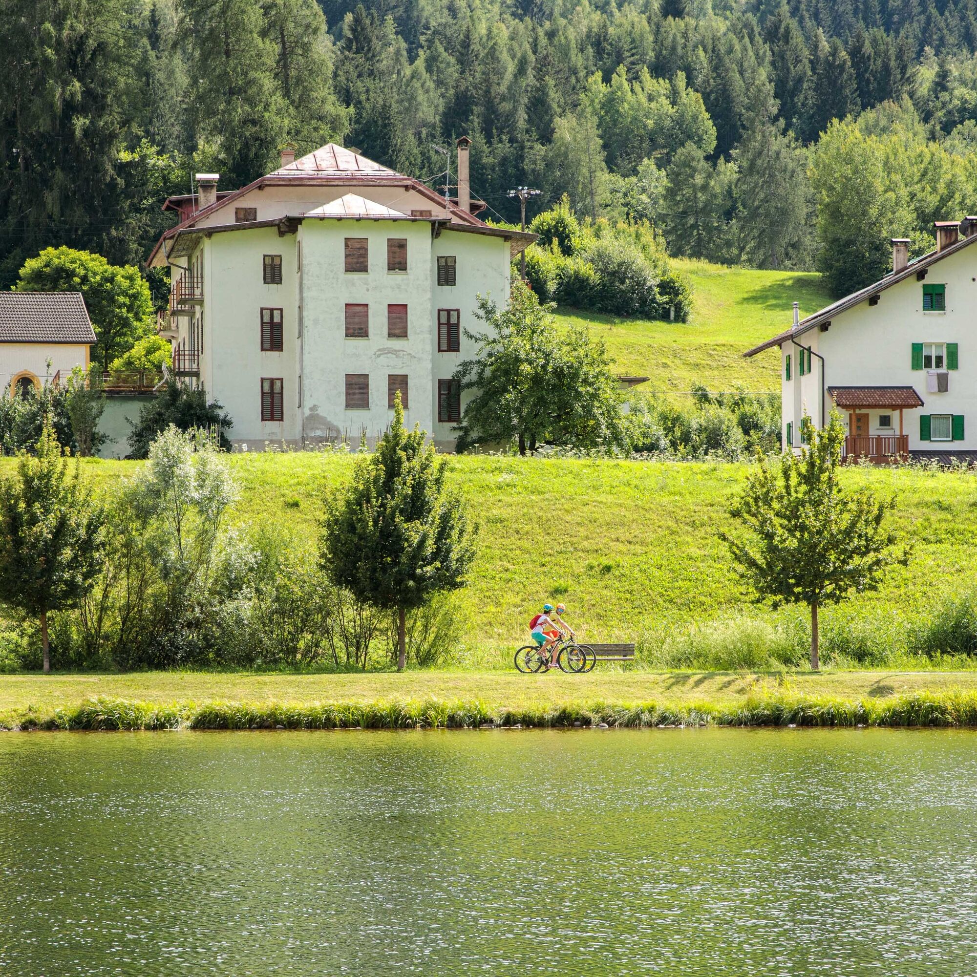 Starting from the main square, descend to the valley floor (limit your speed). Cross the Avisio river and reach the pond in Lago di Tesero. Continue along the cycle route of the Dolomites surrounded by green meadows until you reach Masi di Cavalese. This route boasts an amazing view on Cavalese and the towns of Ville di Fiemme, at the foot of Mount Corno Nero. After passing through the lovely centre of Masi di Cavalese, a climb starts leading to the area of Marco first and to Piera then, among meadows facing the Lagorai mountain chain. Cross the main street then follow a narrow road that leads near the bridge in Tesero. Ride on the main street for the last section of the route, getting back to the main square.